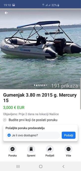 Gumenjak gotovo Nov vožen svega nekoliko puta. Pogodan jer se sastavlja u dijelovima tako da stane u prtljažnik auta. Motor je mercury 15ks sa komadama (volan i gas na ručicama). Servis napravljen na kraju prošle sezone. Prva registracija 06/2016god.