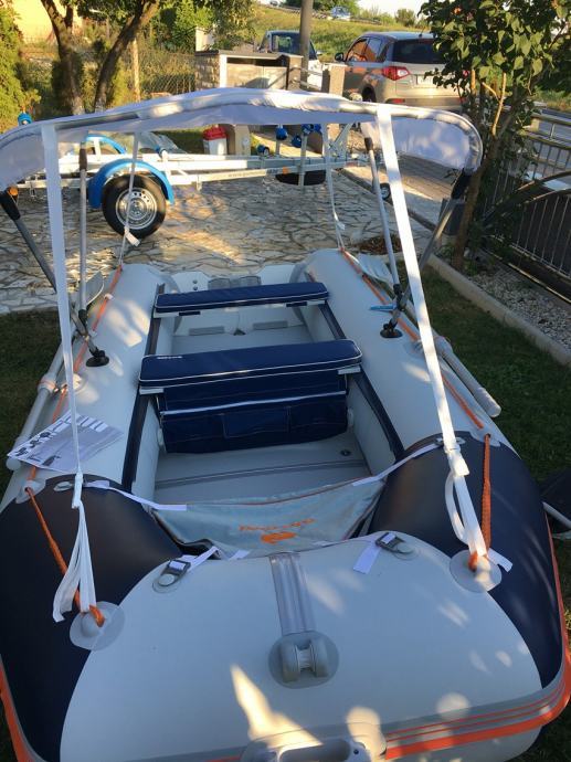 STANDARDNA OPREMA: vesla, pumpa, set za popravak, torba za čamac i pod, vodilica sidra, kobilica na napuhavanje, ručke za transport, uzdužno sigurnosno uže, 2 komada uzdužno pomične klupice za sjedenje, samoregulirajući sigurnosni ventili..
