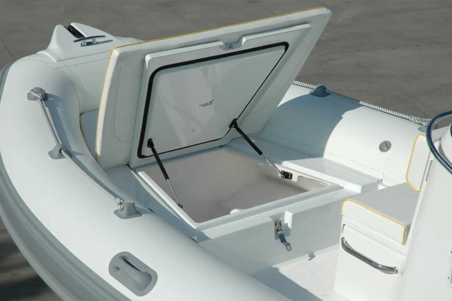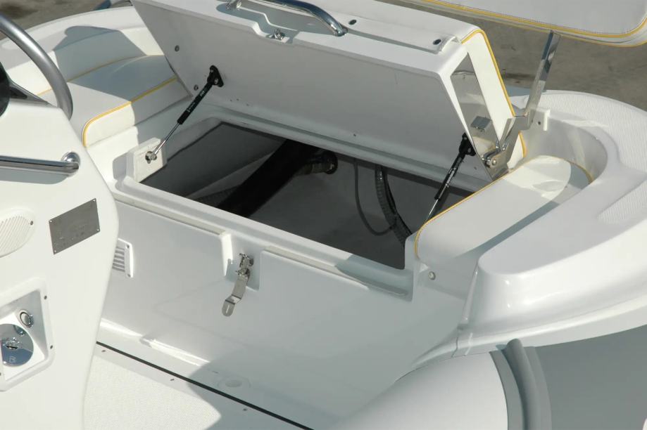 GRP steering console, steering wheel, mechanical steering, windscreen, stainless steel handrail and front seat