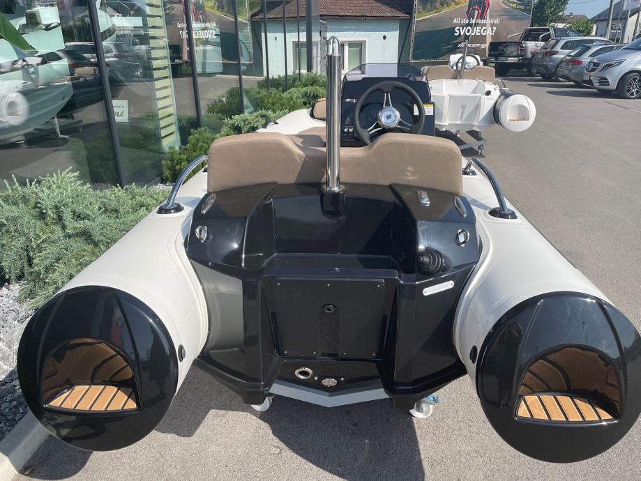 Pramac plovnog objekta opremljen je prednjom stepenicom, pričvršćivačem za vez i navigacijskim svjetlima sa strane, a završava se udobnim sjedalom od materijala SILVERTEX koji propušta vodu i brine se da se tkanine na plovilu brzo osuše. Kao što smo već spomenuli, dodatna bočna klupa nudi dodatnu ladicu za pohranu i također ima ugrađene držače za čaše. Pored glavne konzole nalazi se INOX držač, a tube su opremljene ogradama istog materijala, za dodatnu sigurnost putnika. Glavna klupa, unatoč ograničenom prostoru, široka je i ispod nudi veliki prostor za pohranu predmeta, tende, nužnih stvari za čamac, itd. Prednja strana klupe također nudi mogućnost montaže dva AUDIO zvučnika koji će svakako obogatiti iskustvo tijekom plovidbe. Krma čamca završava s dva stepenika, što omogućava lakši prijelaz iz stražnjeg dijela u središnji prostor. Ako ste zaljubljenik u adrenalinske aktivnosti ili želite uživati u vodenim sportovima sa svojom obitelji ili prijateljima, brigu o tome će preuzeti drog za vuču, koji je pozicioniran na sredini krme. Stražnji tubusi završavaju s ugrađenim stepenicama od poliestera. To omogućava lakši ulazak iz vode i pomaže većoj stabilnosti čamca pri plovidbi.