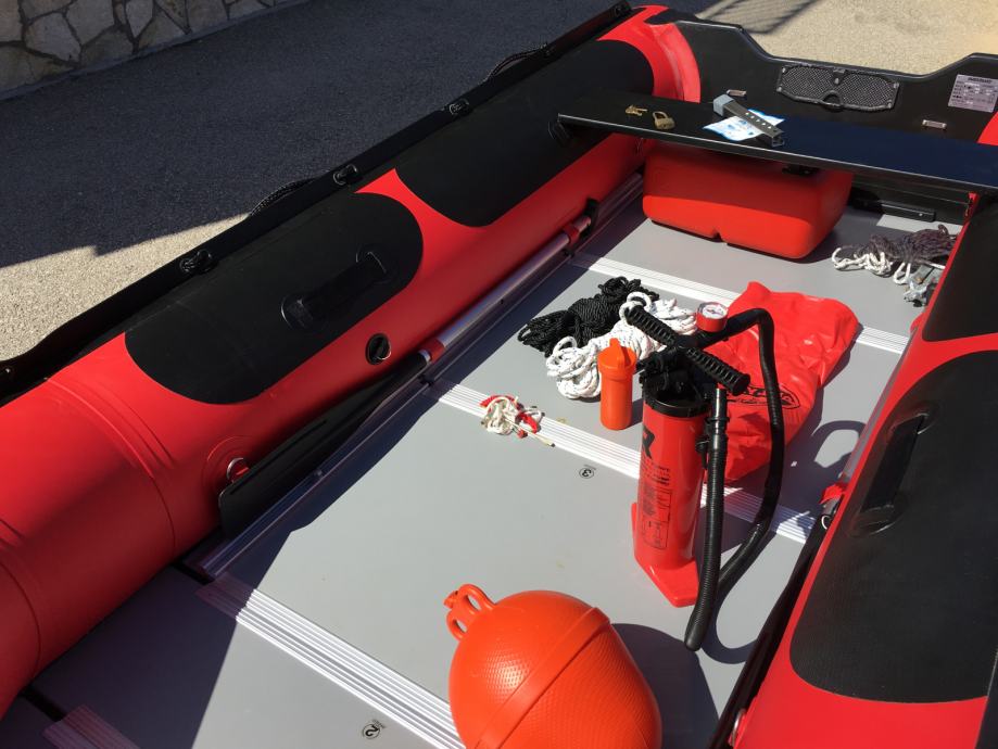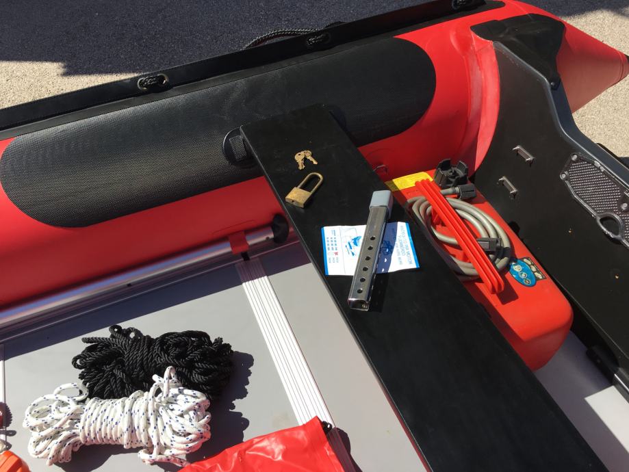+ stalak za motor + rezervoar + oprema uz čamac (sidro, vesla i komplet za poravak, set za zaštitu motora od krađe) + kotači za prijenos