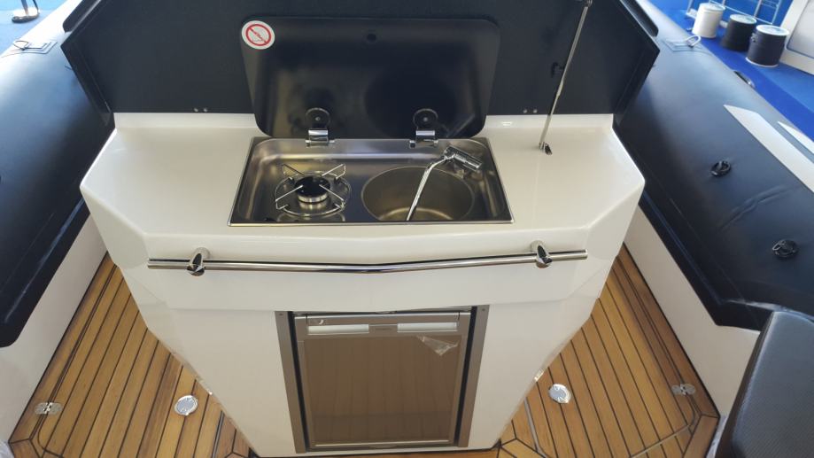 Tvrdi krov, pramčani propeler, podvodna LED svijetla, QUICK punjač batt. produžena platforma za kupanje, Paket Tikovina + kokpit + paluba,ljetna tenda, Bar u kokpitu (kuhalo,sudoper,hladnjak). Motor diesel - Z-pogon + LCD-zaslon + navigacija.