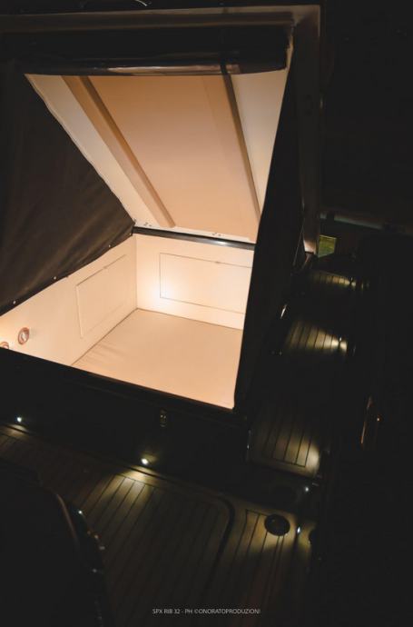 Sve na Spx Rib 32 dizajnirano je kako bi se pojednostavio život na brodu. Dvostruki pristup na krmi je praktičan i siguran zahvaljujući čeličnim ogradama i vodi do prostrane palube za sunčanje. Pažljivi dizajn trupa, gdje je težište blago pomaknuto prema pramcu, omogućio je puno prostora na krmi, gdje ima mjesta za prostranu sunčanu palubu i praktičnu blagovaonicu za goste, te iznimnu dinamičku udobnost za vlasnika, koji može uživati u neusporedivoj stabilnosti vožnje pri svim brzinama. Kuhinja je standardno opremljena sudoperom i hladnjakom te se može podešavati. Kormilarska stanica s dvije elegantne ergonomske stolice dobro je opremljena i intuitivna, nudeći iznimnu udobnost vožnje. Ponudu upotpunjuje opcionalni T-top od stakloplastike, koji je dostupan i s integriranim tušem. Njegov luksuzni dizajn udobno prima do 16 gostiju za očaravajuća krstarenja.