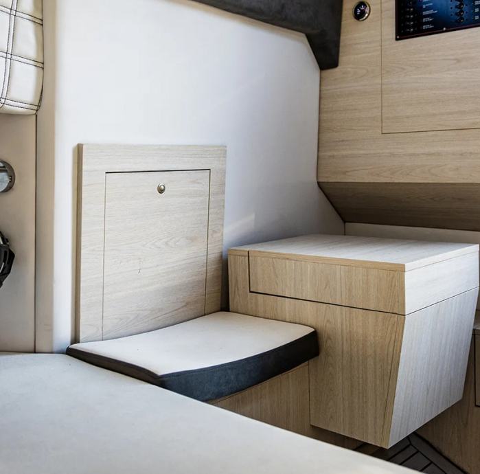 Konzola s dvostrukim sjedalom koje se može pretvoriti u odmorište za bubrege, s osloncem za noge, ogradom od nehrđajućeg čelika, vjetrobranom, dimljenim kliznim vratima za pristup ispod palube i prostorima za pohranu