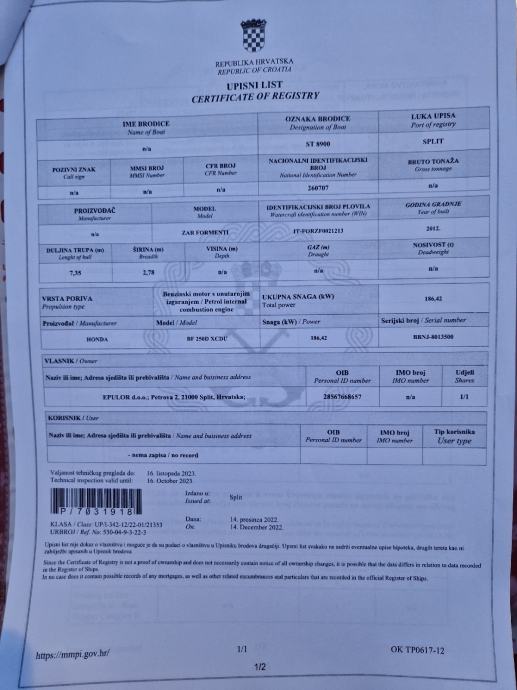 2012. godina, brod nikad nije bio u najmu, nalazi se 3 mjeseca ljeti u moru zimi na suhom vezu u zatvorenome. Guma bez zakrpe, puno dodatne opreme (Lowrance fishfinder sa sondom, bimini, inox lanac i sidro, radio Fusion, sve vrste lezajeva, kušina, stol, dva akumulatora i još mnogo toga).