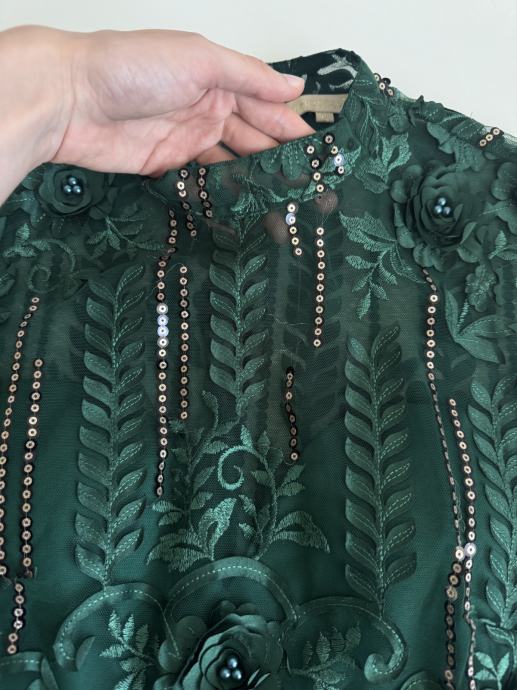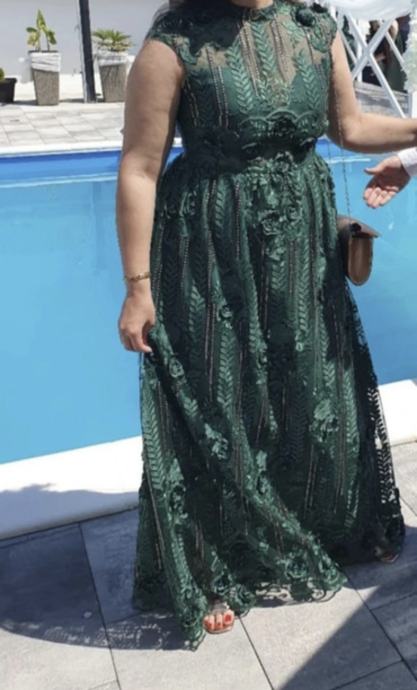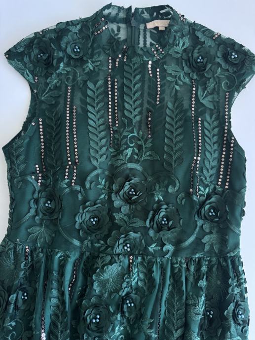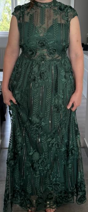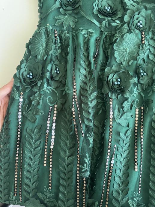 Predivna svečana zelena haljina sa 3D cvjetovima i ljuskicama, veličina L/XL.