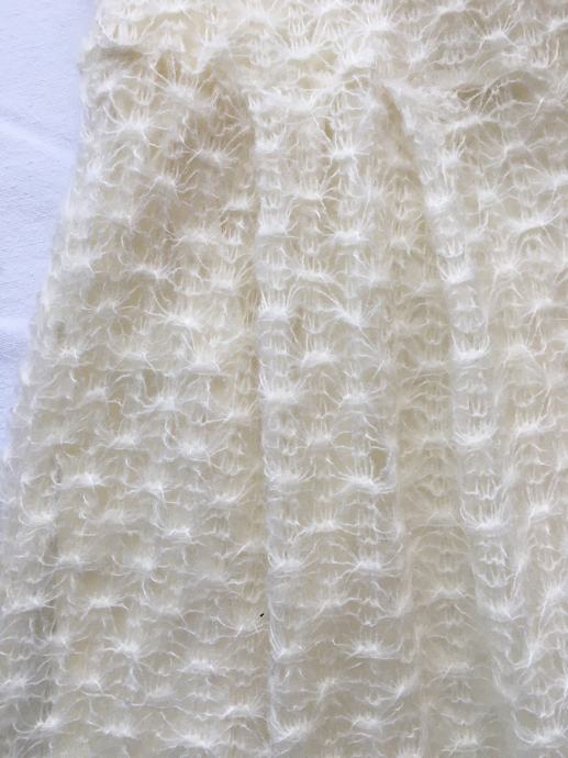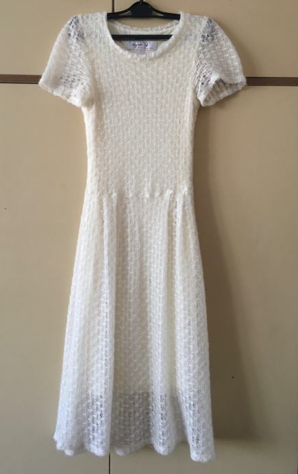 Predivna bijela zimska haljina poznate francuske dizajnerice Agnès b. Jednostavna, okrugli izrez oko vrata, kratki rukavi, ali ne prekratki, rezana u struku, po dvije faldice lijevo i desno naprijed i otraga, tako da se prema dolje lagano širi i dopire do listova nogu. Bez patenta, oblači se preko glave. Vuneni materijal rupičast i paučinast, "oblačast", zahvaljujuči tkanju i visokom udjelu moher vune. Postavljena ugodnom džersej tkaninom, mekanom, koja podatno pada (sastav najlon 85%, elastin 15%). Postava ušivena oko vrata i oko rukava, a u struku slobodna. Oko 15 cm kraća od haljine, tako da materijal haljine može doći do izražaja.