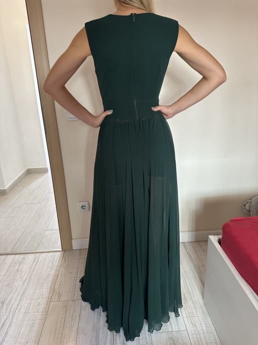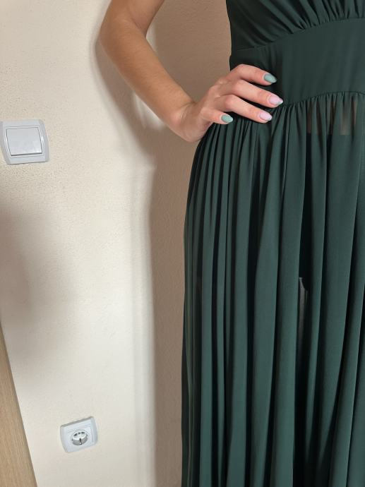 Zelena duga haljina, dizajner: Arileo. Veličina izmedu S i M, tamno zelene boje. Donji dio se prozire. Jednom nošena i kemijski očišćena.