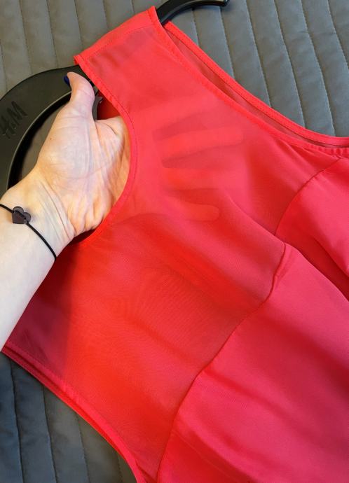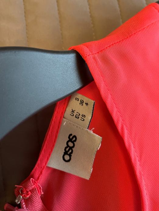 Prodajem Asos laganu haljinu u veličini 36. Boja je između narančaste i crvene. U gornjem dijelu (iznad prsa) hajina je prozirna. Duljina je 90 cm, širina u prsima 90 cm, a u struku 70 cm. Potpuno je nova, nikad obučena, samo su skinute etikete.