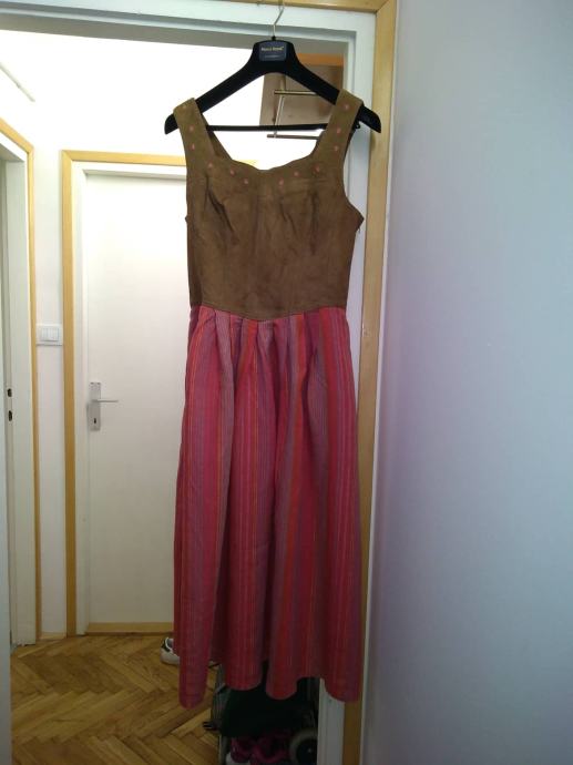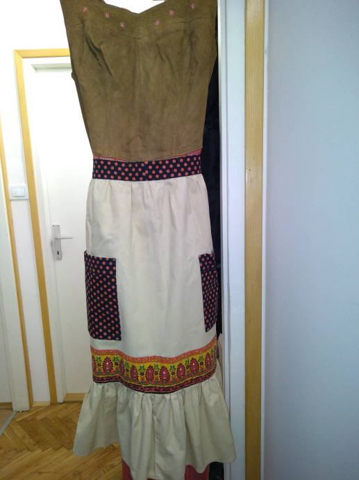 Veličina varira jer iza ima kožne trakice za skupljanje i otpuštanje tako da paše 38, 40, 42. Kombinacija prave kože sa lanom haljina, bluzica i pregača pamuk. Nošena samo jednom. Moja osobna. Nema nikakvih oštećenja, nošena jedan dan. Pogledati i preuzimanje Zagreb-Gajnice.