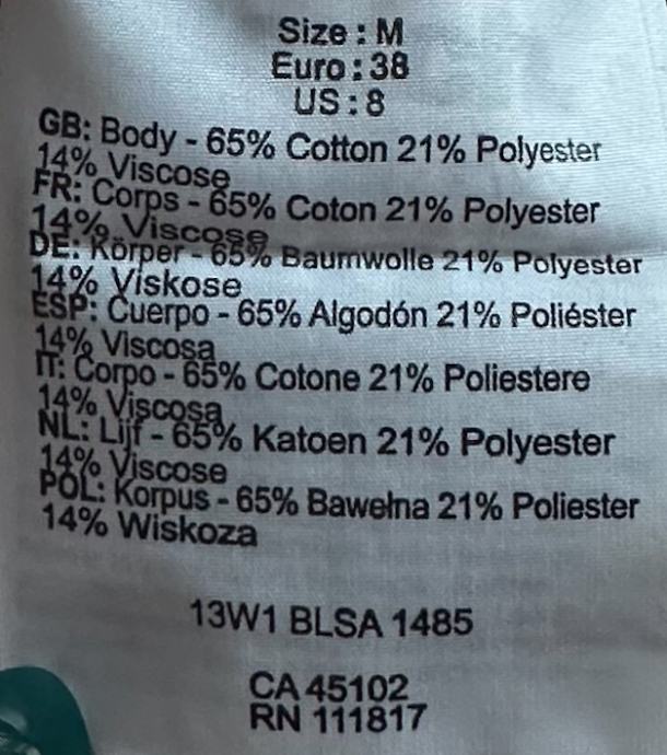 Mjere: dužina 90 cm, gornji dio 60 cm, ramena 40 cm, prsa 45+ cm, struk 43 cm, rukav 64/51 cm.