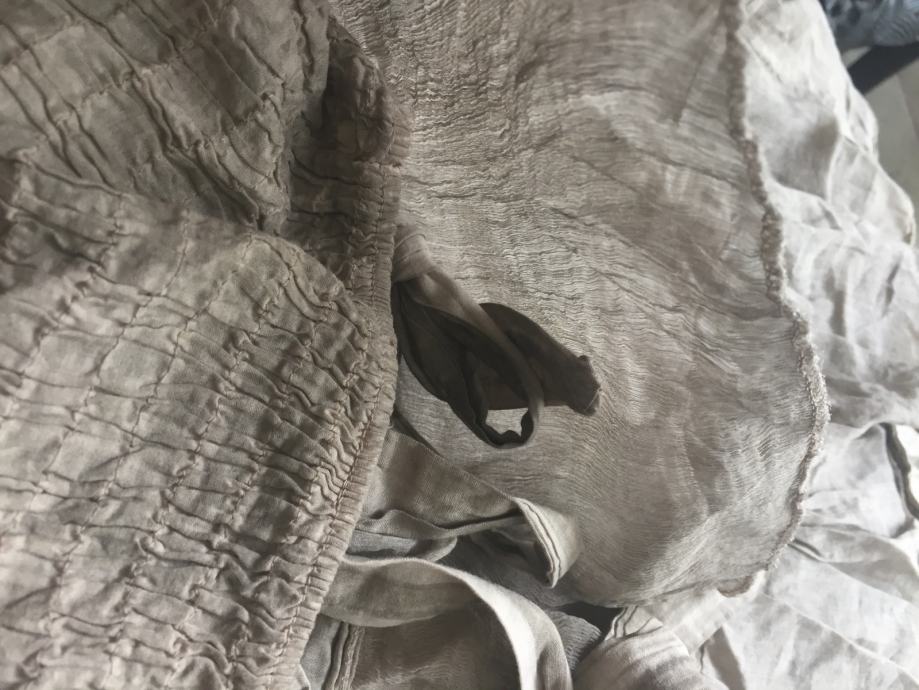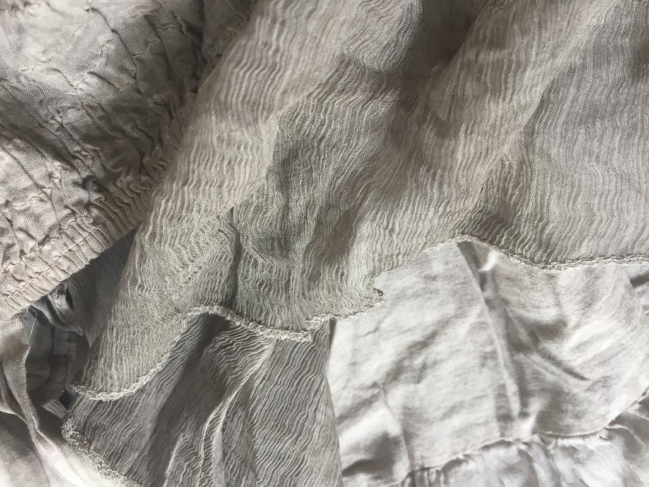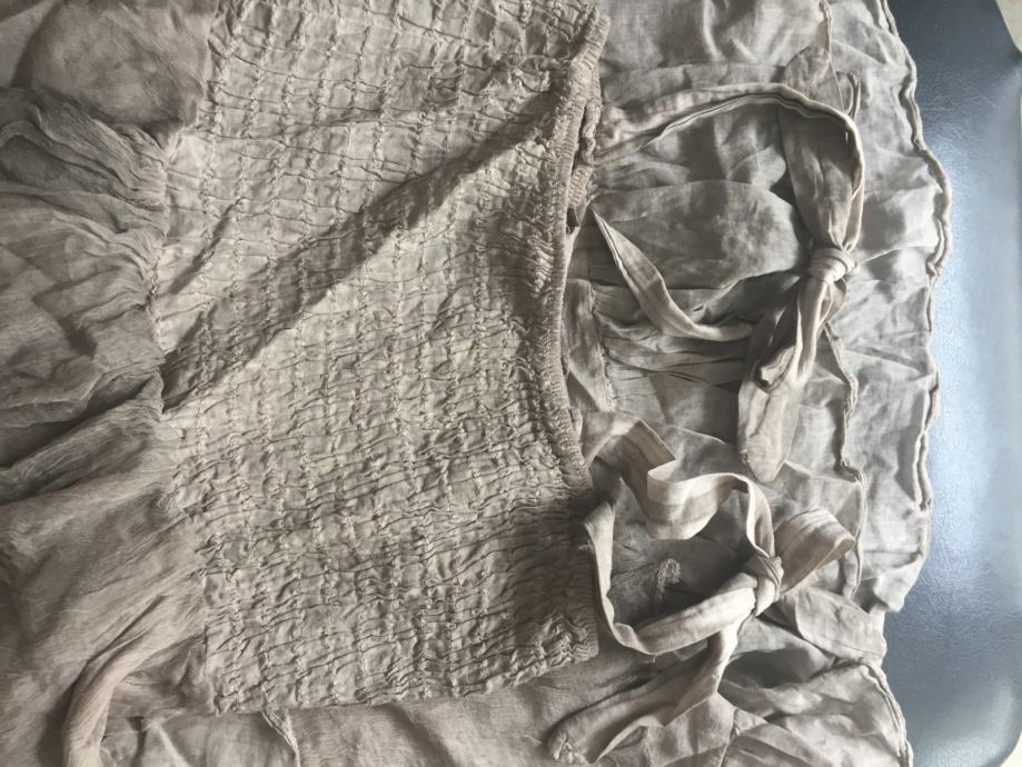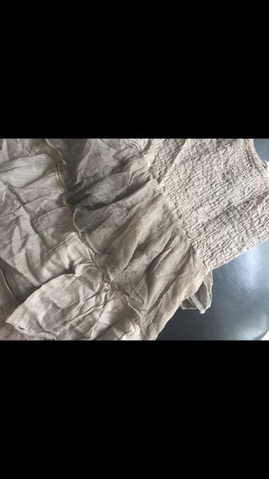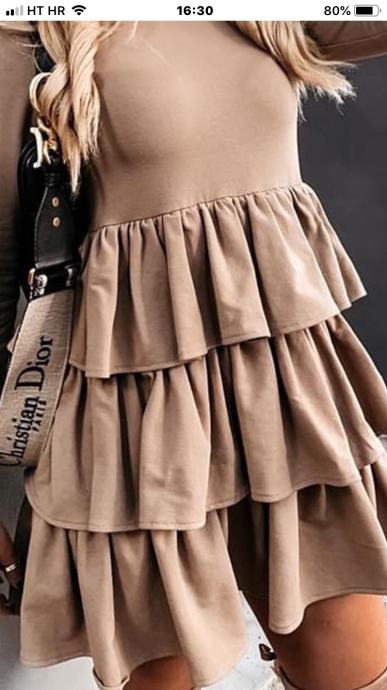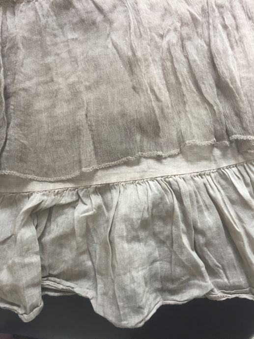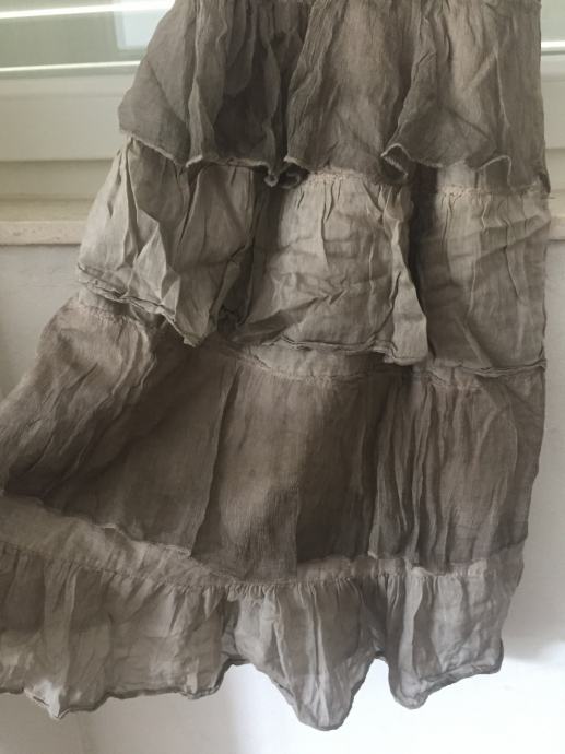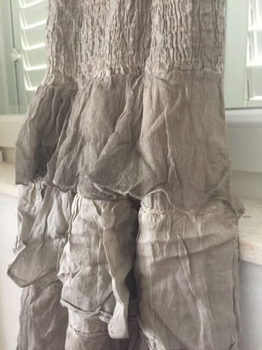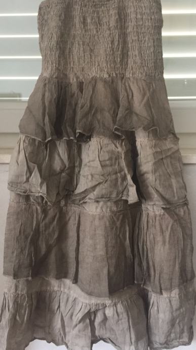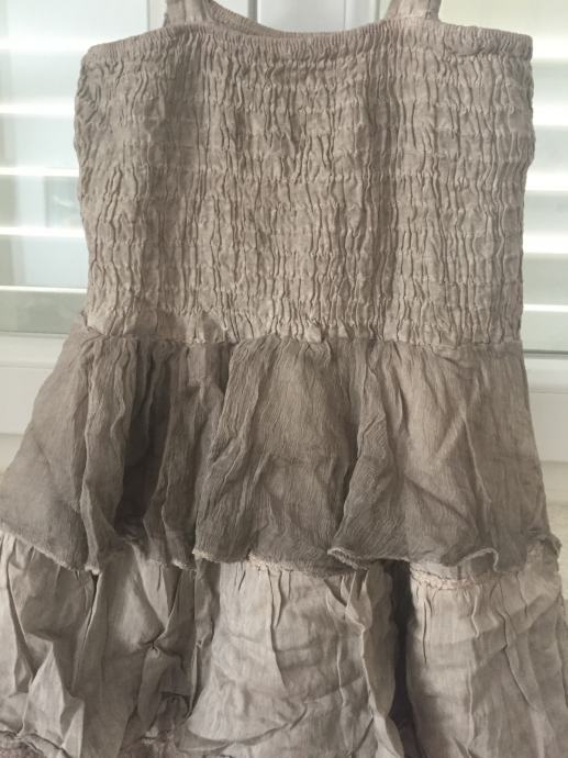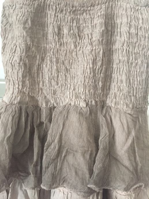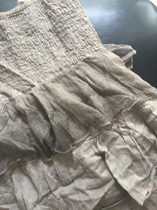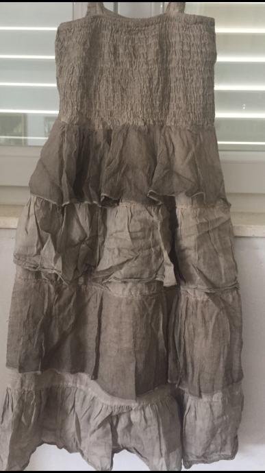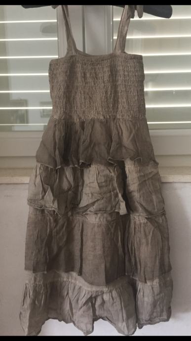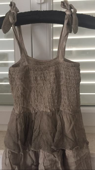 Efektna lagana lepršava haljina neutralne boje pijeska..sa bretelicama na mašnu..gornji dio elastične “žabice”...mix svila i pamuk..drapirani volani od prave svile..podstavljena te se ne prozire.....odgovara vel.S/M/L...novo!(zadnja slika s neta kao prikaz sličnog modela...)