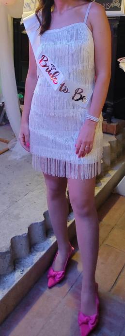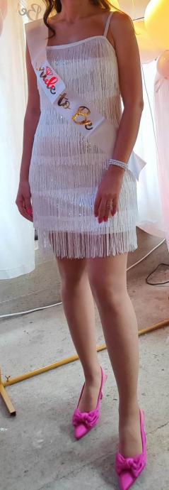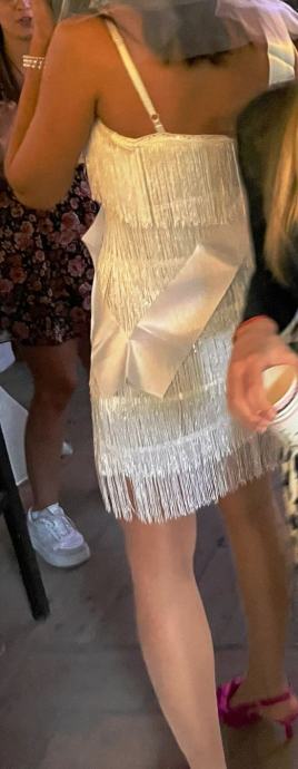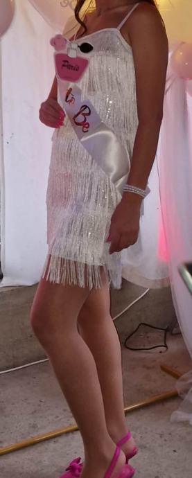 Bijela kratka haljina s resama. Ispod resa su ušiveni svjetlucavi srebrnkasti "cd-ići" pa haljina svjetluca. Naramenice se mogu podešavati. Patentni zatvarač je na leđima. Haljina mi je bila malo široka ispod ruke, pa sam ju ručno ušila s obje strane ispod ruke, ne vidi se od resa, ali može se odšiti po potrebi. Nosila sam je jednom, na svojoj djevojačkoj.
