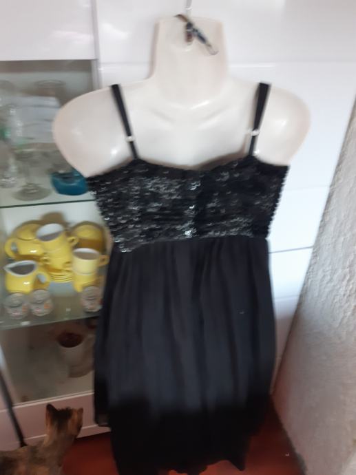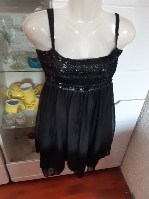 BLIND DATE crna lepršava haljinica s bretelicama, žabice u prsima s ljuskicama. Vel. XS. Sirina prsa, prednja strana: 36 cm, duzina: 74 cm. Sastav: poliester.