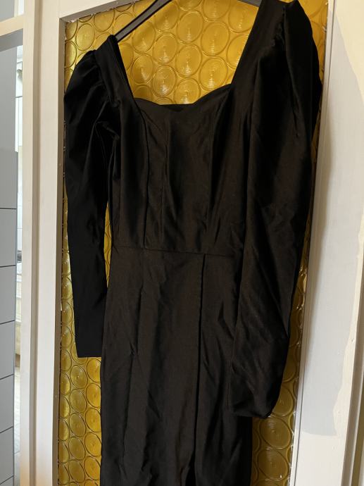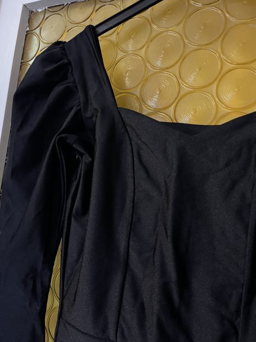 Haljina od dvostruke sjajne tkanine, s puf rukavima i prorezom. Fino stisne i savršeno naglašava. Veličina M. Ogovara standardnoj konfekciji M/38.