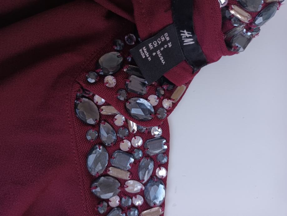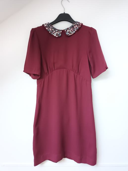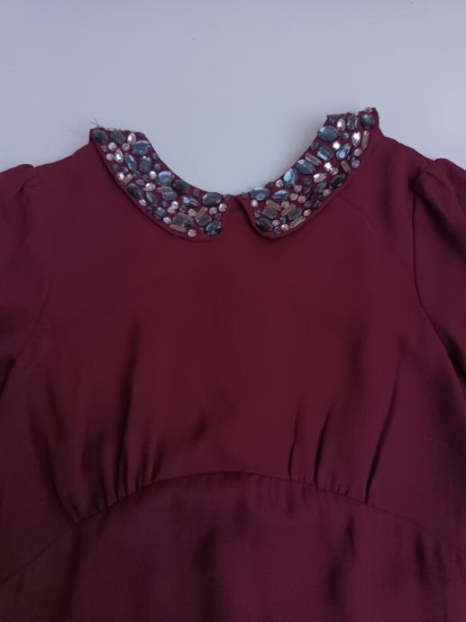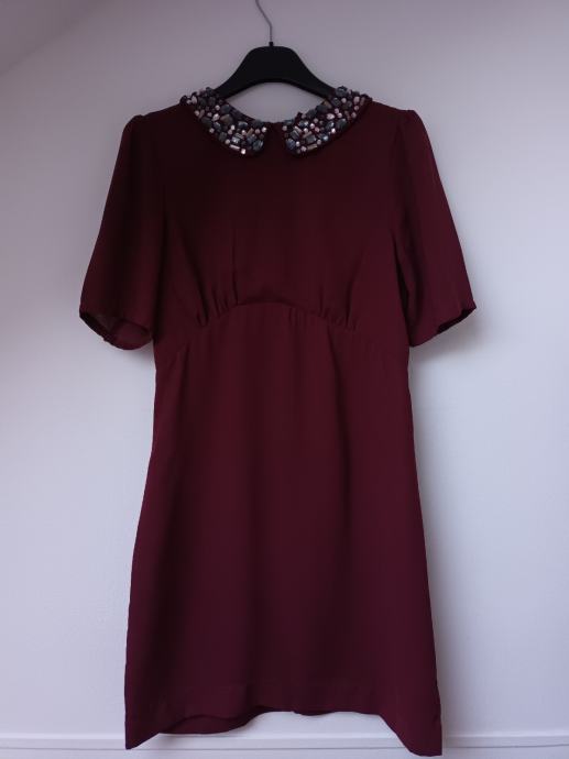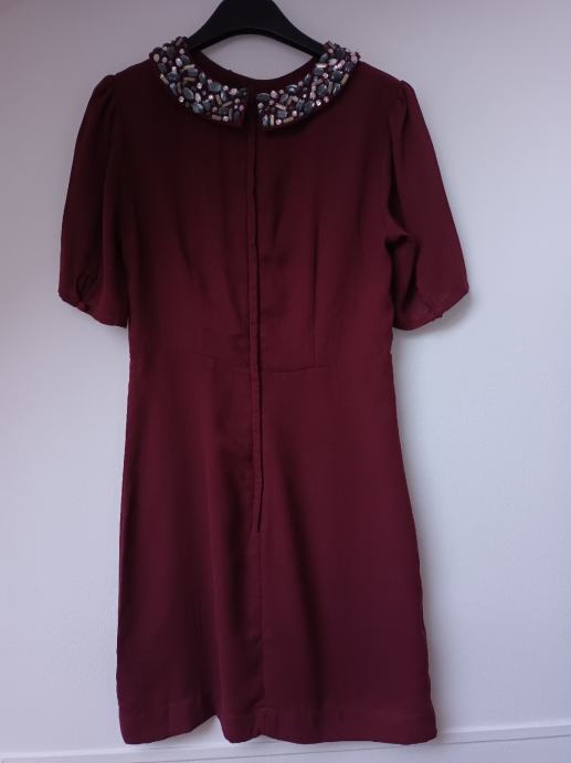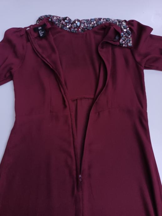 Bordo mini haljina 36 HM svečana sa kamenčićima na okovratniku kopčanje nevidljivim zipom posred leđa nenošena duljina po sredini 81cm širina od pazuha do pazuha 43cm u struku 37.5cm predivna i idealna za blagdane