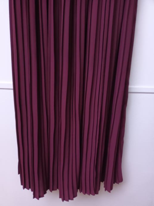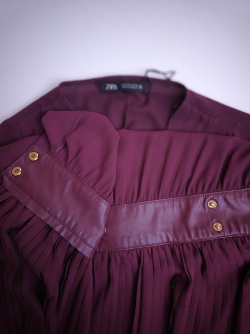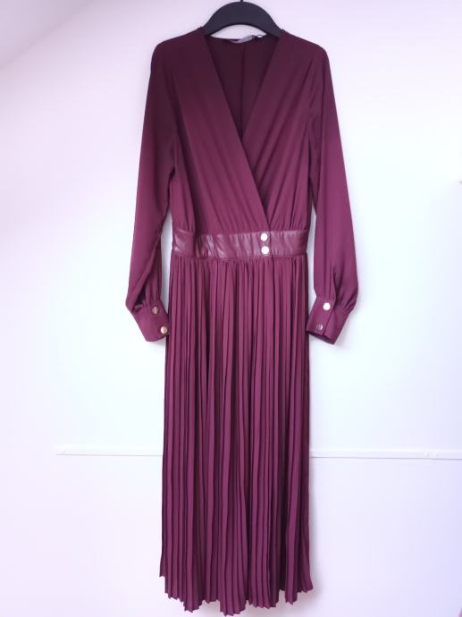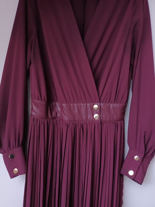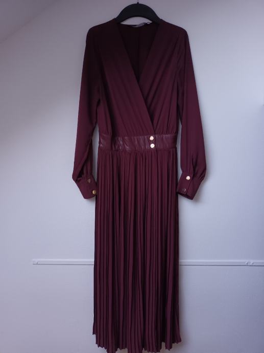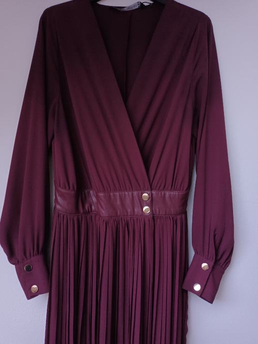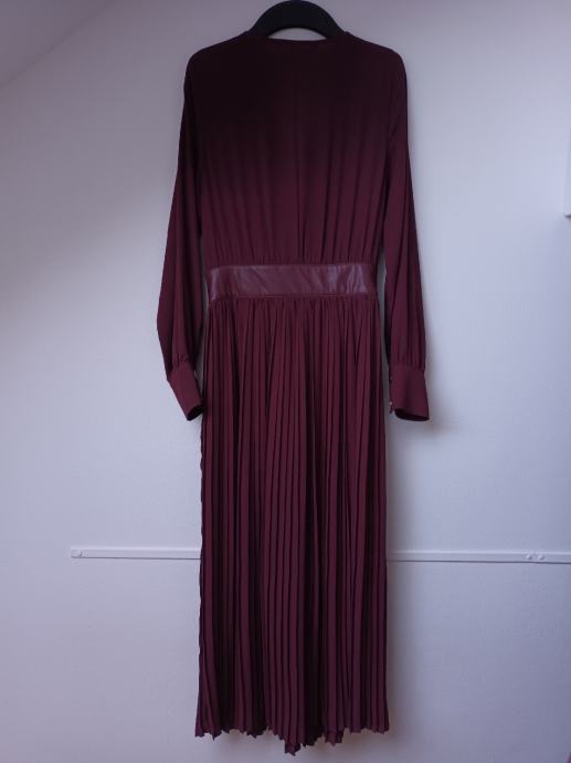 Bordo plisirana haljina ZARA 36 novo predivna vrlo otmjena elegantna i decentna, pokriva i dekolte i koljena, za formalne i poslovne prilike kopča se na tri gumba u struku a osjećaj je kao da nemate ništa na sebi, lagana je, predivne zagasite boje može i na salonke i na čizme duljina po sredini 128.5cm širina od pazuha do pazuha 42.5cm u struku 34cm