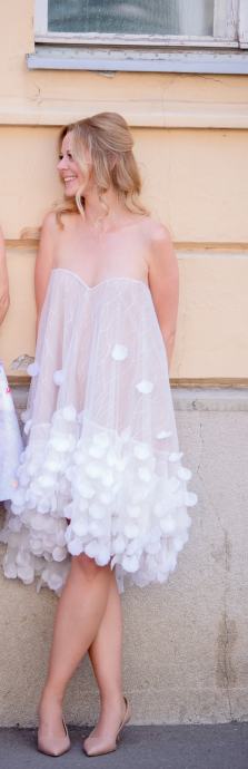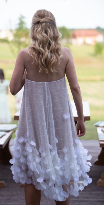 Prekrasna Boudoir vjenčanica - za posebne mladenke koje ne mogu svoju vjenčanicu iz snova pronaći u klasičnim salonima. Tri sloja tkanine - najdonji sloj je boje kože, zatim sloj lagano šljokičastog tila te treći sloj tila s navezenim listićima. Gornji dio je "nevidljivi" til koji sve drži na okupu tako da možete bez straha plesati. One size, zapravo od 36-40. Super opcija i za trudnice. Kupljena u lipnju 2021., jednom nošena, oprana, bez oštećenja. Više fotki šaljem na upit. Ako ste u Zagrebu, možete je doći pogledati.
