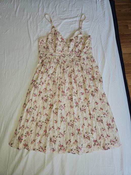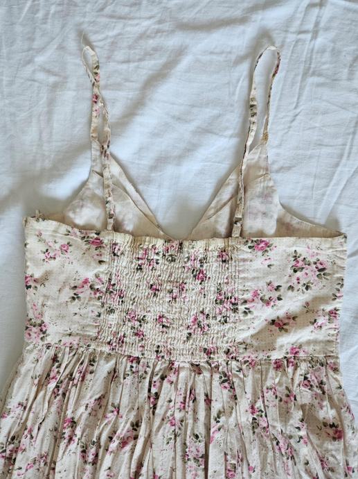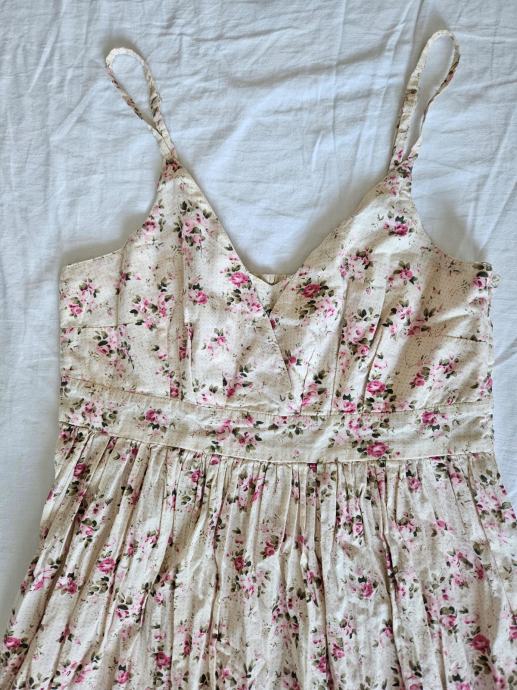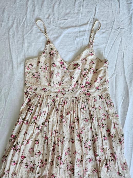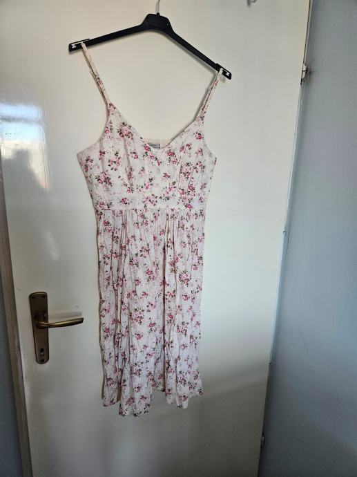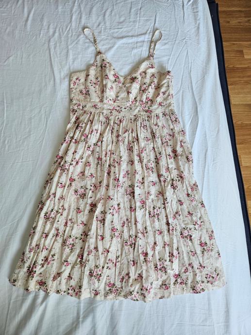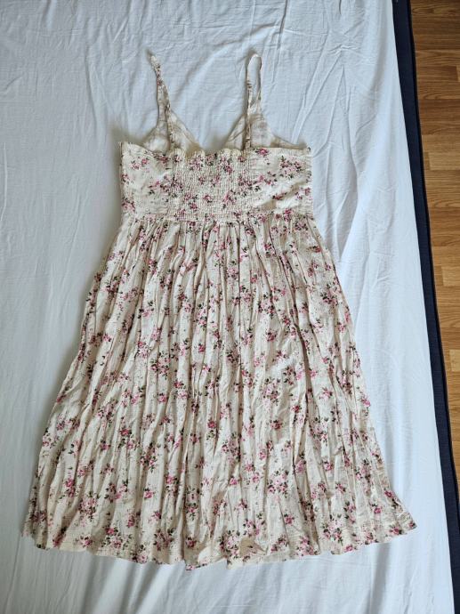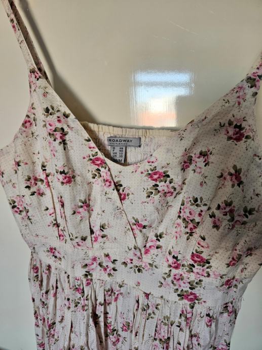 Prekrasna ljetna Broadway haljina. Krem boje sa ružičastim ružama. Pamučna, lagana, podstavljena u području prsa pa nije potrebno nositi grudnjak. U prsima je strukirana, a odostraga ima gumu te se rasteže i prilagođava širini prsa. Sa strane ima šlic. Bretele su podesive dužine. Duljine malo iznad koljena. Veličina M , 38. Malo nošena, očuvana.