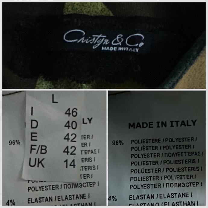 Deklarirani L, idealna za 42, mjere: dužina 97 cm, ramena 40 cm, prsa i struk 52 cm, rukav 56/40 (4/5).