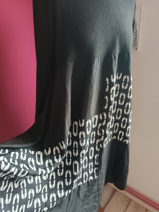 Crna tunika ili haljina s dugim rukavima i bijelim geometrijskim uzorkom na prednjem dijelu. A-kroj.
