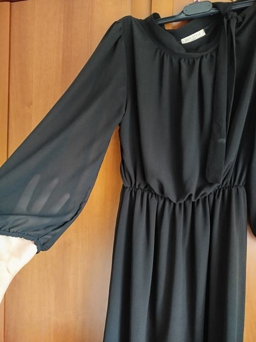 Elegantna crna haljina veličine 36, s 3/4 rukavima, novo stanje bez etikete. Haljina je dužine do koljena i savršena je za razne prigode. Jednostavnog, a sofisticiranog dizajna s istaknutim strukom, idealna za slojevito kombiniranje.