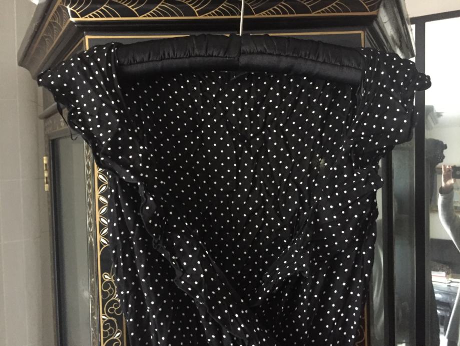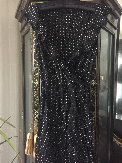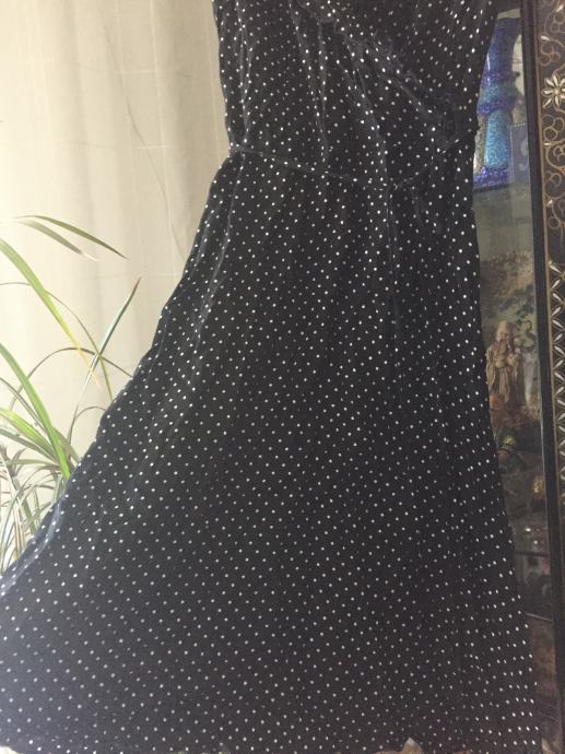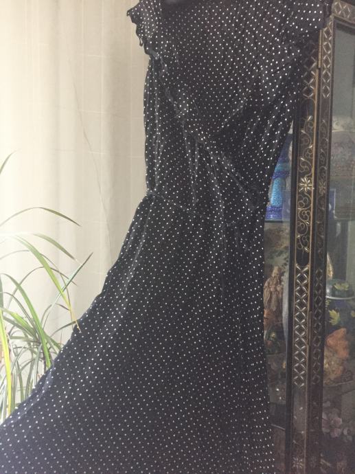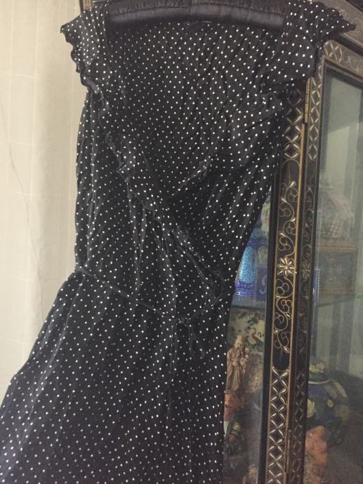 H&M efektna romantična crna haljina na bijele točkice sa volanom ,na preklop...vrlo lagana,lepršava..duga vezica u struku...vel.36-38 cca....viskoza...kao nova!