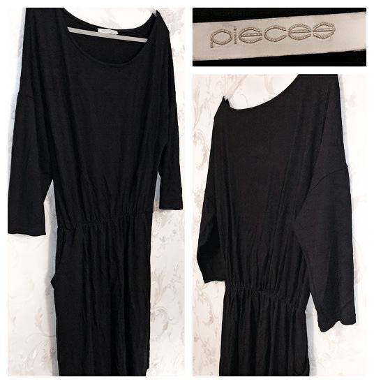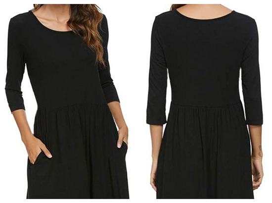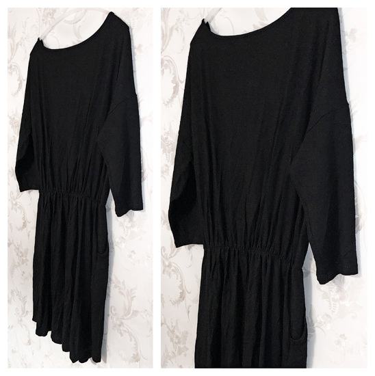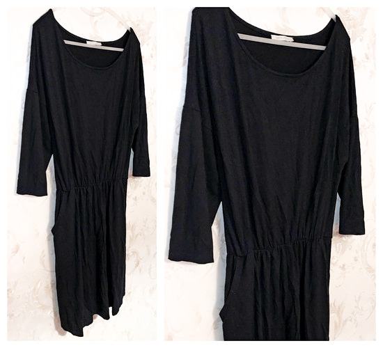 Crna haljina / tunika ovalnog izreza, s 3/4 rukavima, lastikom u struku i džepovima.