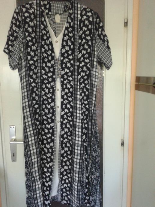 Crno-bijela haljina na preklop (ispod preklopa je bijeli dio), malo nošena. Otraga se veže. Viskoza, lako se održava, veličina 42