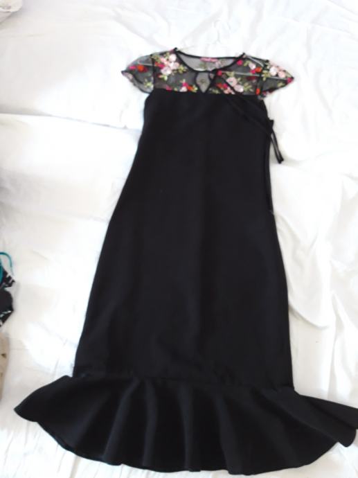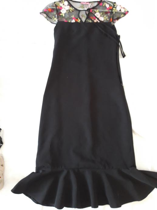 Lijepa crna haljina s šarenim čipkastim uzorkom. Par puta nošena. Ako ste vješti sa švanje., možete je prekrojiti na različite načine, s volanom na struku, ispod grudi, kao mini...