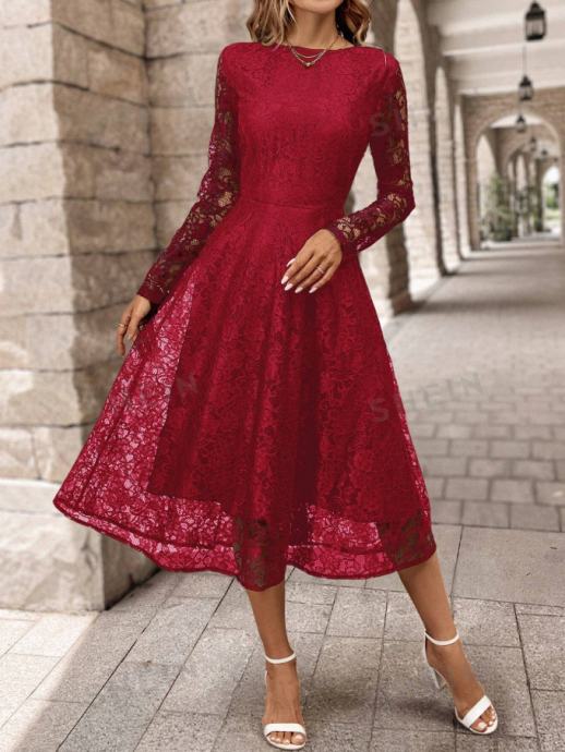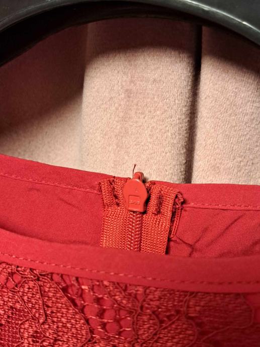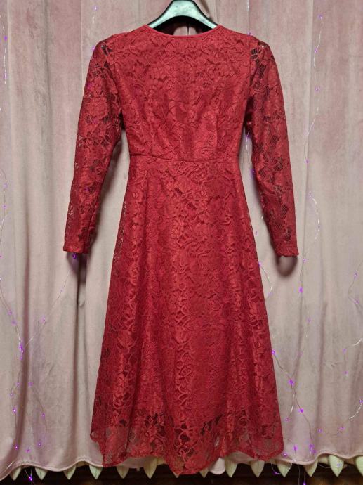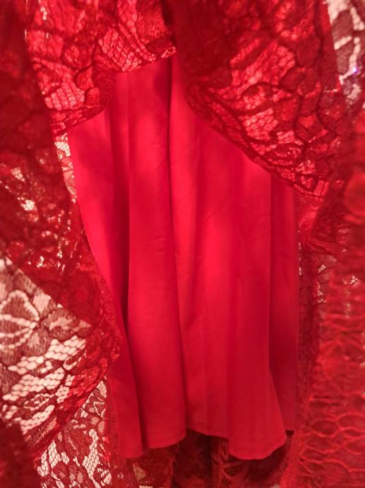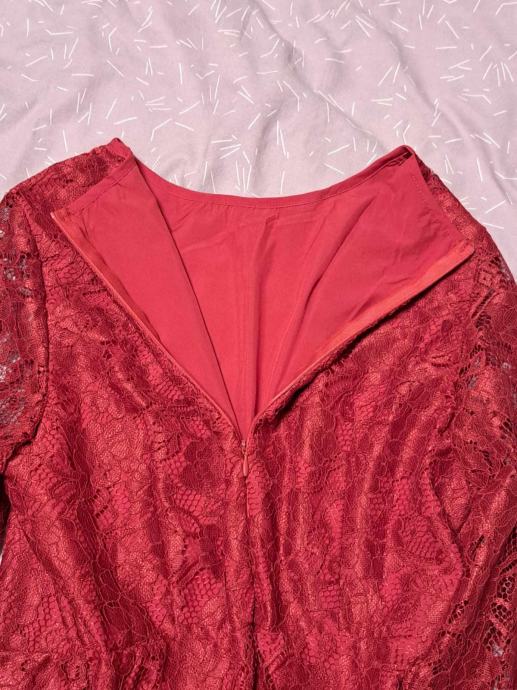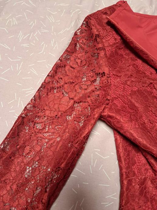 Prekrasna, nova, elegantna crvena čipkana haljina s dugim rukavima, ima podstavu te je idealna za svečane prigode, proslave ili večernje izlaske. Haljina je udobna i ženstvena. Veličina 42. Dimenzije : Ramena: 41 cm, Prsa: 104 cm, Struk: 82 cm, Duljina: 122 cm, Duljina rukava: 63 cm.