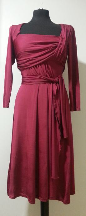 Predivna haljina boje vina materijal je poput druge kože, ima sa obje strane dvije dugačke i široke trake koje se mogu omotati i križati na leđima po želji, naprijed istaknut dekolte sa nabranim materijalom, jako efektna i zavodljiva a vrlo otmjena i elegantna, TOP SHOP veličina 38 a vrijedi i za 36-40, plaćena duplo više i nošena u dvije prigode.