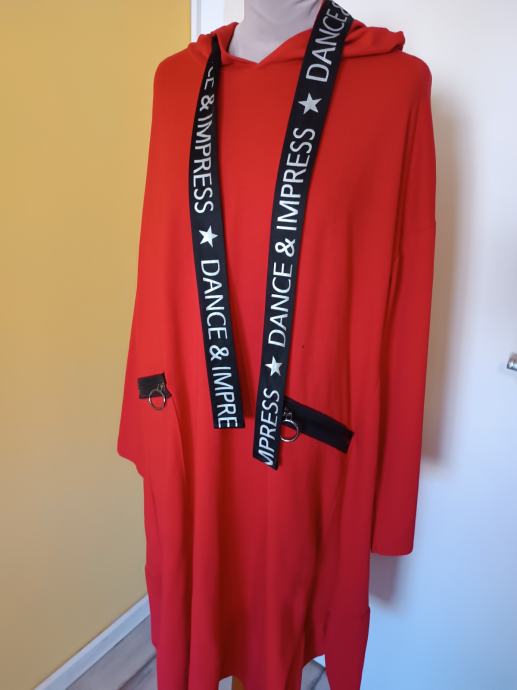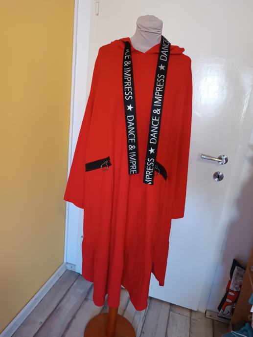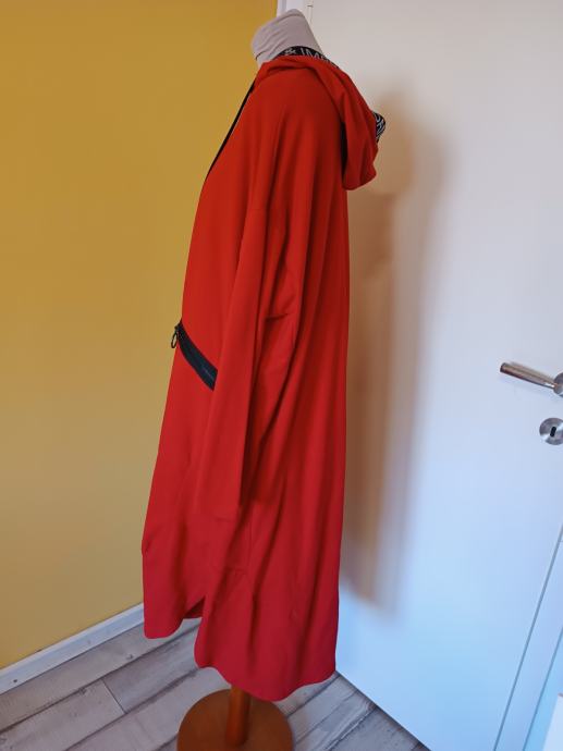Nova predivna crvena haljina s kapuljačom i dva velika crvena džepa na prednjoj strani s patentom. Nosi se široko, ali najbolje za brojeve 46, 48, 50. Ležeran, oversize kroj.