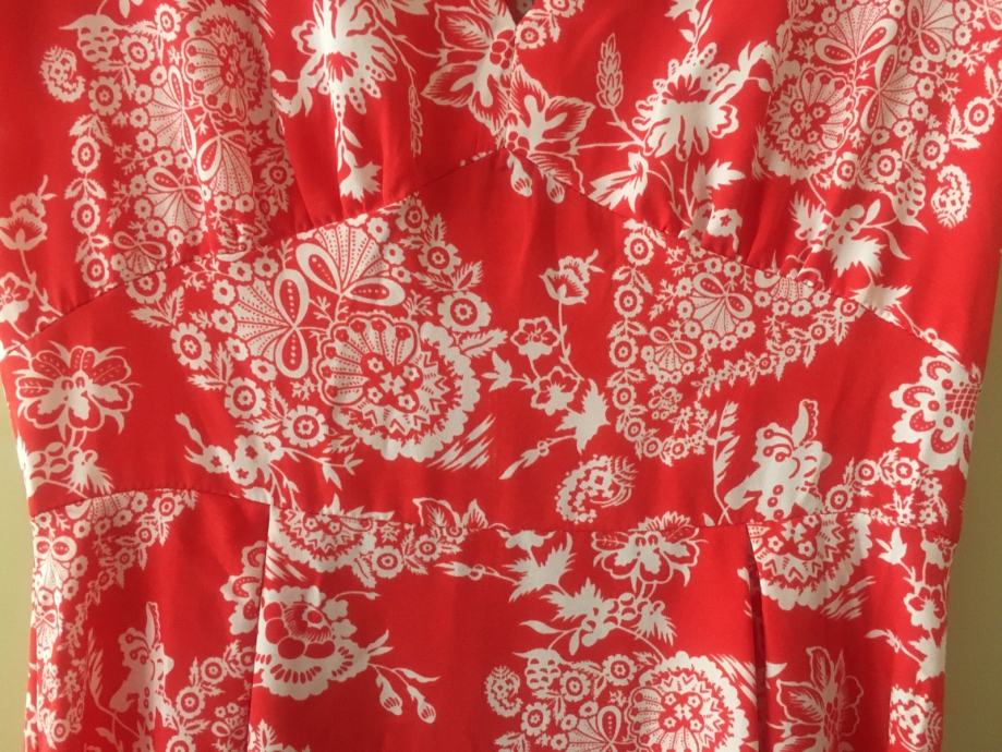 Svježa proljetno-ljetna haljina u svijetlo-crvenoj boji. Kratki rukavi, dužina nešto ispod koljena. V-izrez. Kroj u stilu 1940-ih godina: rezana u struku, ima dio iznad struka koji se pomalo šilji prema prostoru između grudi, a tkanina je za grudi nabrana iznad tog poprečnog umetka. Na leđima dugački skriveni patentni zatvarač. Suknja se prema dolje lagano širi. Suknja ima po dvije dvostruke faldice naprijed i otraga. I na rukavima, na ramenu, jedna mala isto takva dvostruka faldica. Na leđima ima dva ušitka iznad struka, da oblik haljine prati liniju tijela.