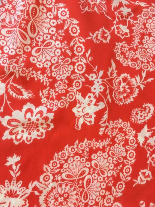 Crvena (crveno-narančasta) boja sa bijelim stiliziranim cvjetno-kašmirskim uzorkom, koji tkanini daje svjež i blistav izgled.