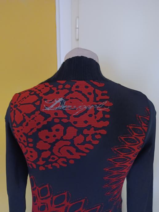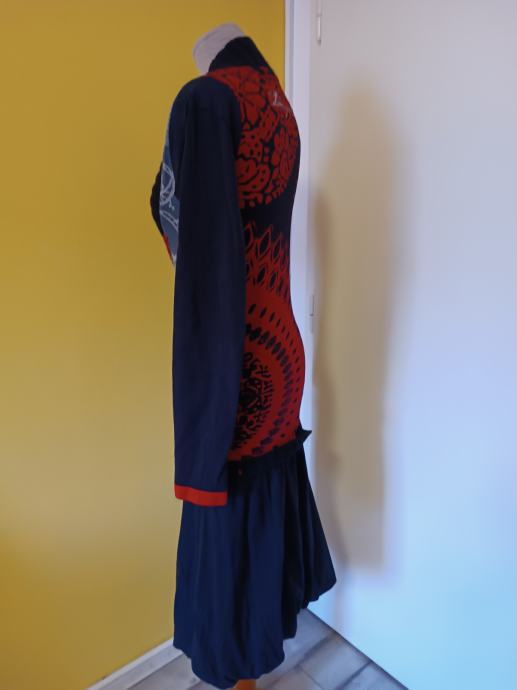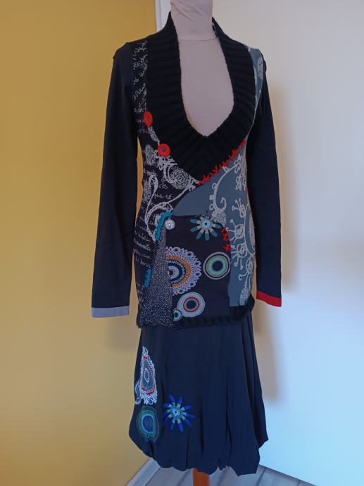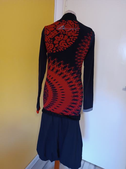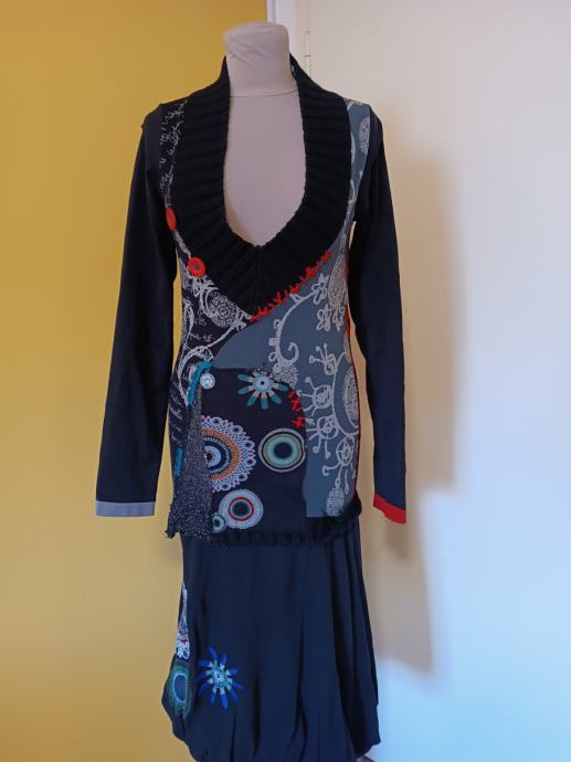 Predivna haljina modne marke Desigual. Bez tragova nošenja. S raznobojnim detaljima (patchwork). Pleteni V-izrez i rukavi u crnoj boji, a donji dio u obliku suknje. Deklarirana veličina M. Rasteže se dosta. Jako topla. Jesen/zima kolekcija.