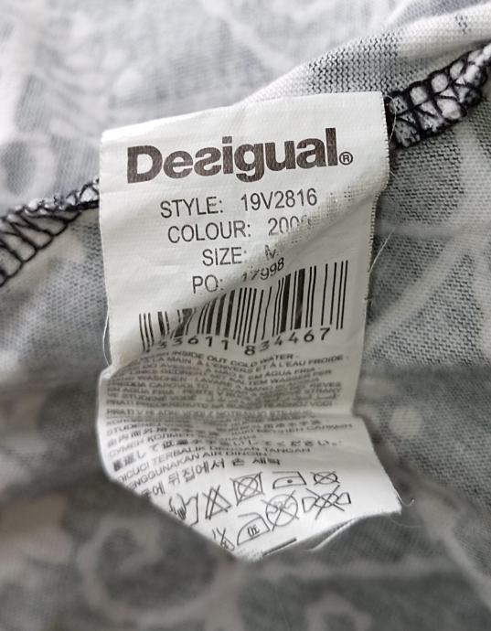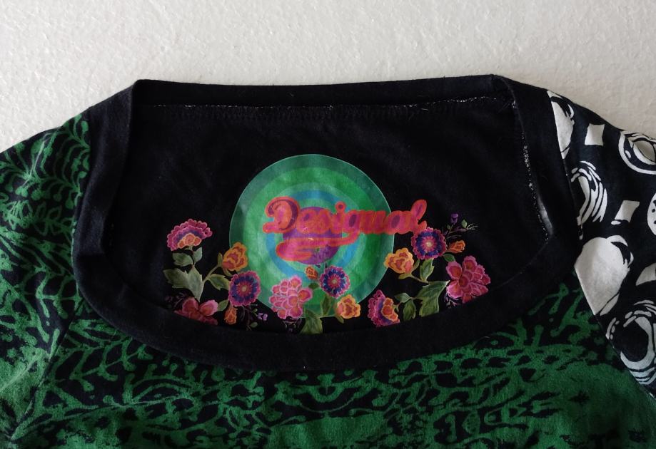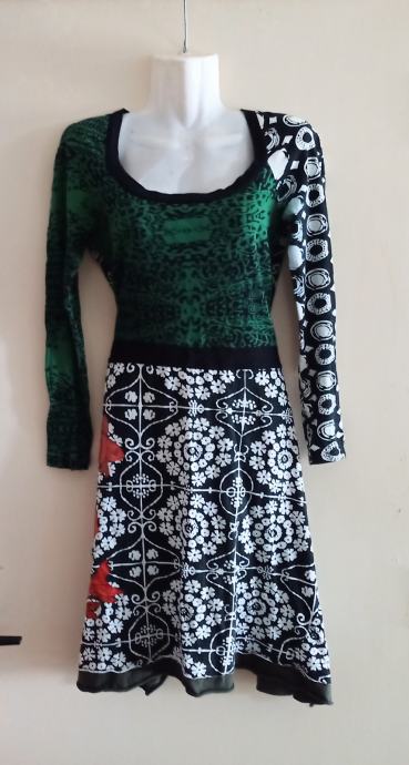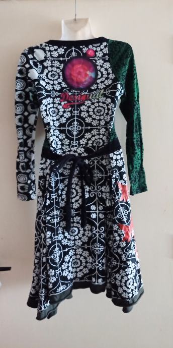 Desigual haljina veličine M (40). Sastav tkanine je 100% pamuk. Ima pojas za vezanje oko struka ušiven u haljinu i dva džepa. Duljina otraga (od vratnog izreza do ruba haljine) je 92 cm. Nekoliko puta nošena i očuvana.