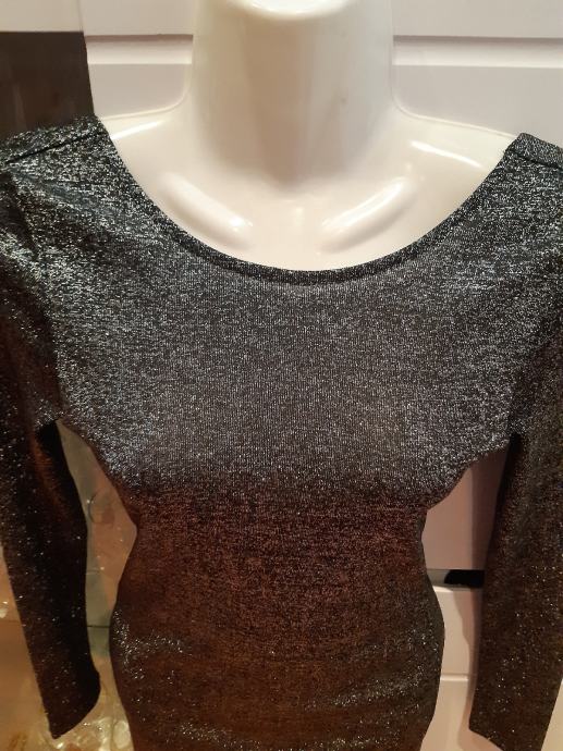DIVIDED srebrna nova haljina dugih rukava, duboki dekolte na leđima. Vel. 34. Surina prsa, samo prednja strana: 36 cm, duzina haljine: 82 cm, duzina rukava: 59 cm.