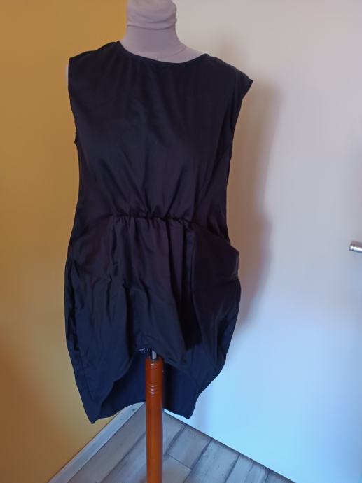 Crna haljina koju bi svatko želio imati u svojem ormaru. Neobičan dizajn. Ispred kraća, a iza dulja. Na prednjem dijelu dva velika džepa.