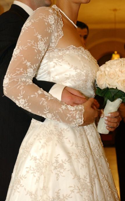 Šivana po mjeri, jednom nošena, talijanska exclusive mekana čipka, boja bjelokosti. GRATIS čipkasti bolero. Vjenčanica odgovara veličini M. Zvati 091.482.59.23