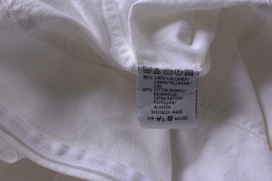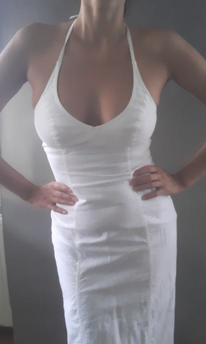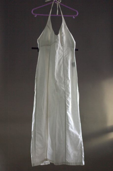 Duga bijela ljetna lanena haljina iz H&M-a, vezanje oko vrata, lijepo stoji. 55% lan, 45 % pamuk. Patent, izrez dolje na sredini odostraga.