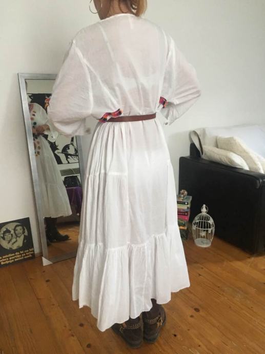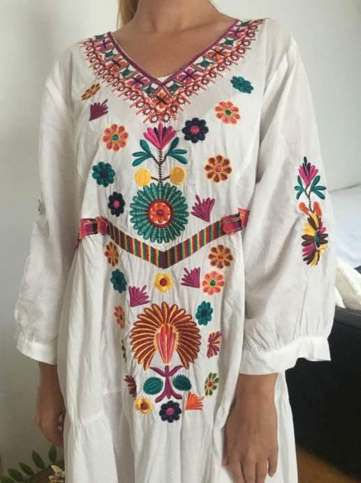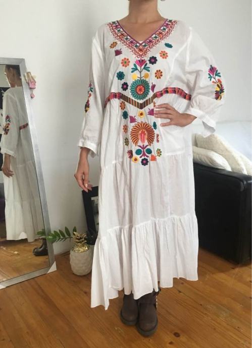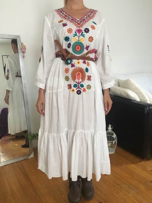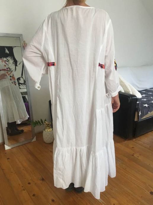 Prekrasna,duga boho haljina- veličina je zapravo univerzalna (na slici je netko tko nosi S). Namjerno fotkana na čizme jer nije striktno ljetna- kombinirajte ju kako vam odgovara. Ručno izvezena,kupljena na putovanju,obučena jednom.