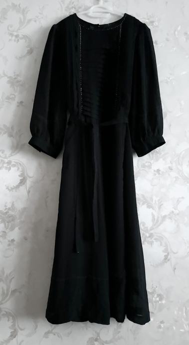 Duga crna haljina sa zlatnim nitima na prednjici.