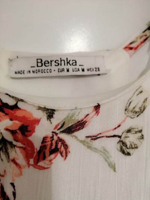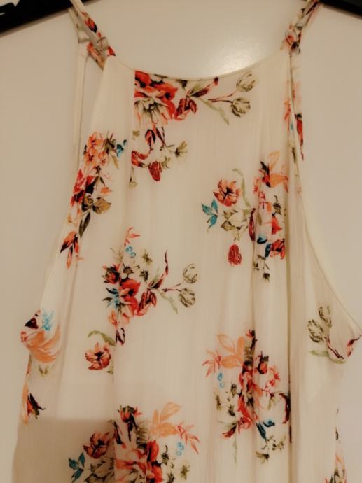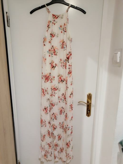 Prodajem jednom obučenu za jednu posebnu priliku cvijetnu haljinu marke Bershka, bijele boje sa cvjetovima, vel. M, sastav 100% polyester, mjere: otvor oko vrata 13cm, otvor rukava 20cm, dužina 130 cm, širina struka 36 cm. Haljina je idealna jer se može nositi kao ispeglana,a i ne mora, haljina ima podsuknju i prilagodljiva je stasu.