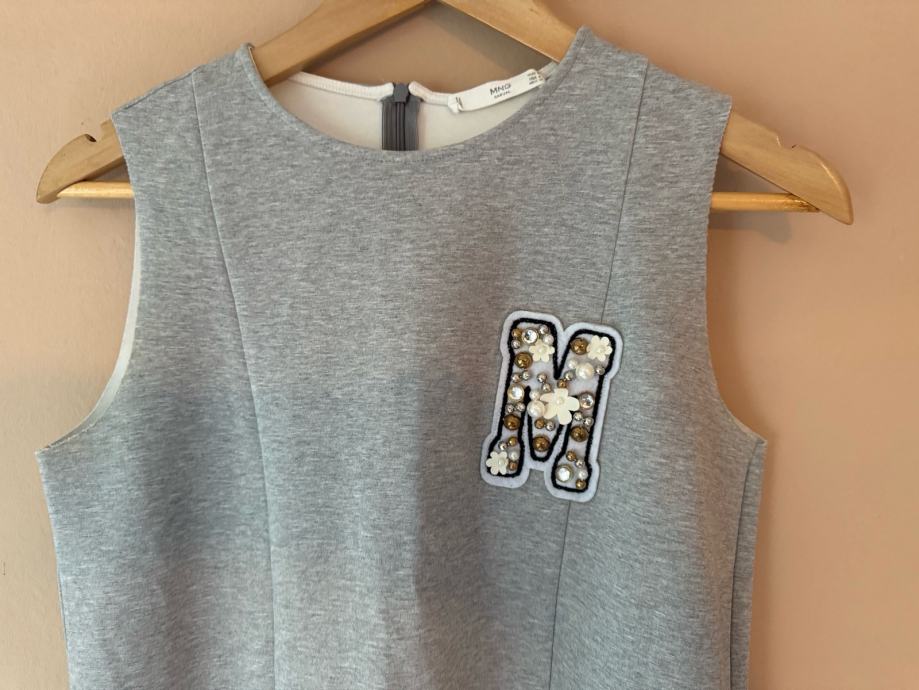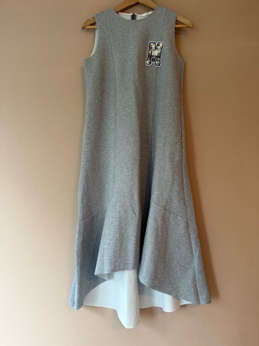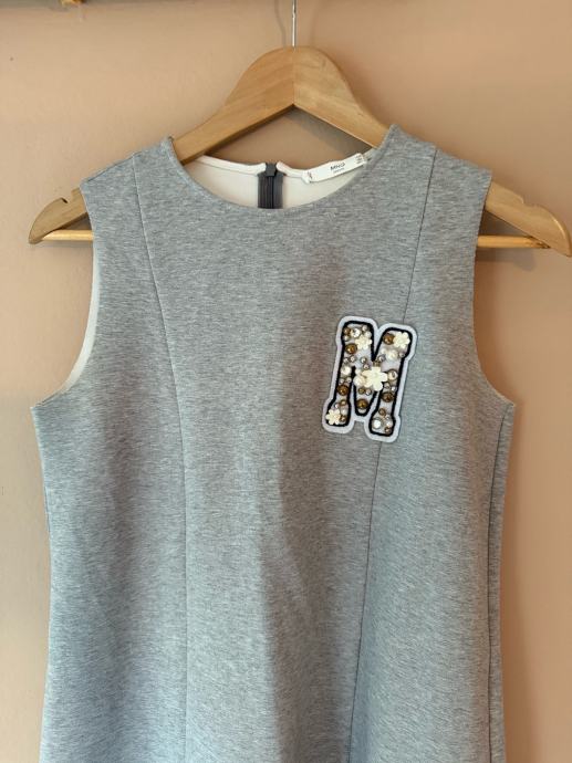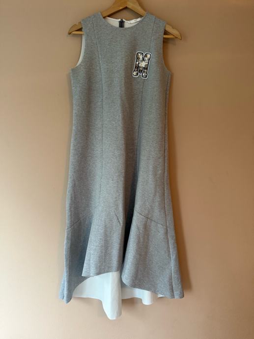 Prodajem dugu haljinu od scuba materijala, veličine 38. Haljina je sive boje, bez rukava, s ukrašenim slovom M na prednjoj strani koje je izvezeno perlama i detaljima u zlatnoj i bijeloj boji. Kroj je proširen prema donjem dijelu, s bijelim uloženim slojem koji se vidi pri dnu. Zatvaranje je na leđima pomoću gumba.