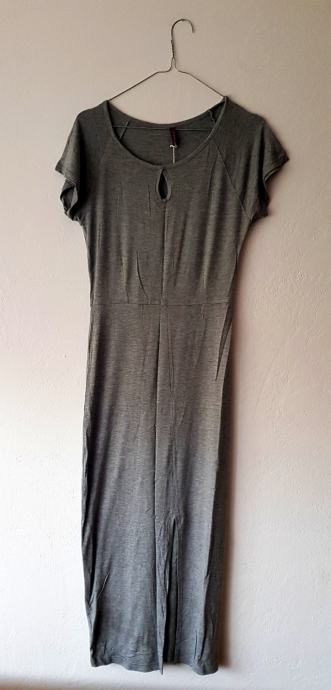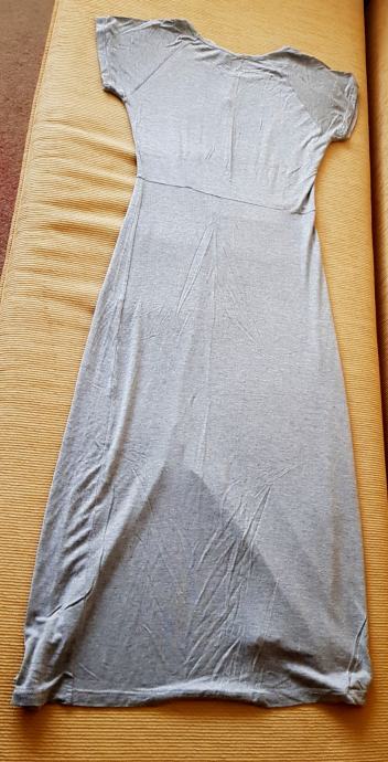 Ženska maxi siva haljina brenda Love Chaim, okrugli ovratnik, mali izrez u gornjem dijelu haljine, kratki rukavi, duži kroj, iznad gležnja, prorez na dnu haljine na prednjem dijelu, rastezljiva, lepršava, širi se prema dolje u obliku zvona.