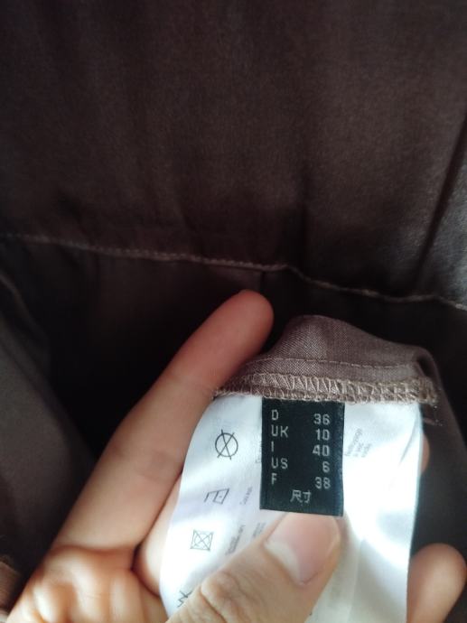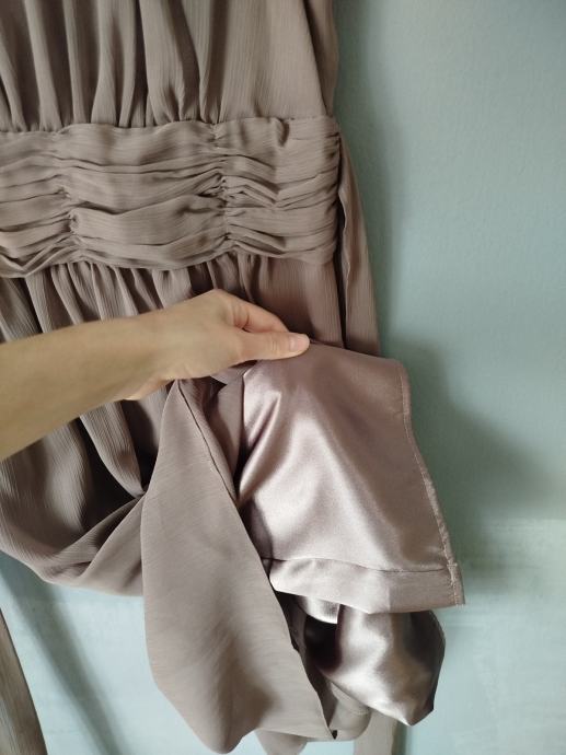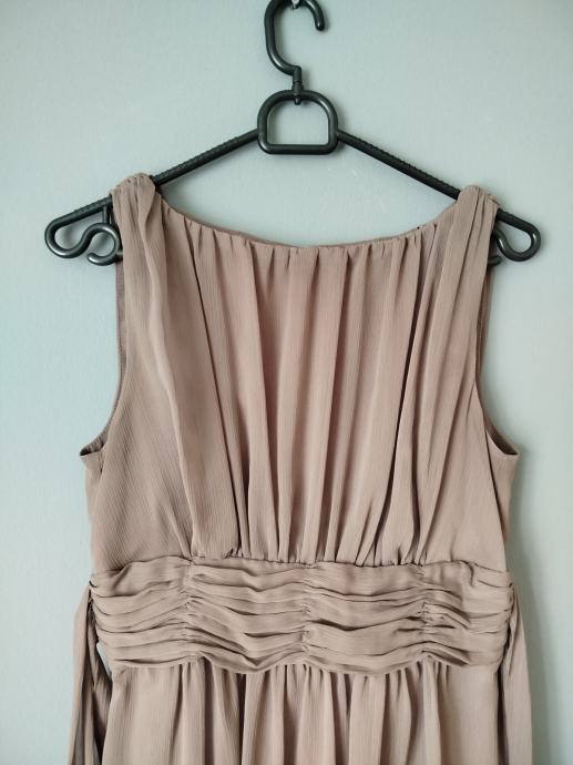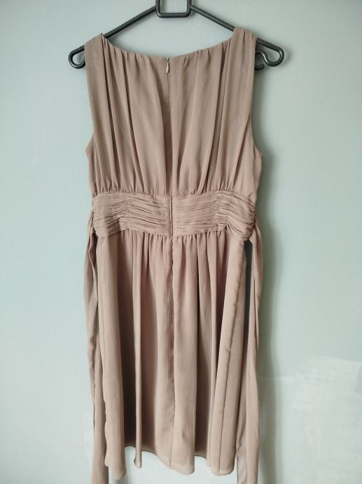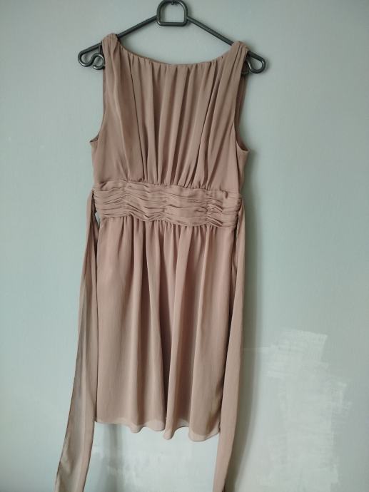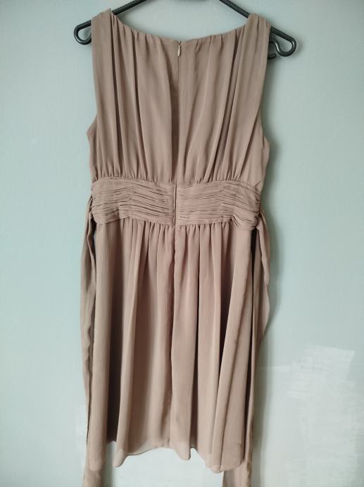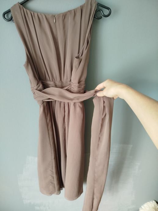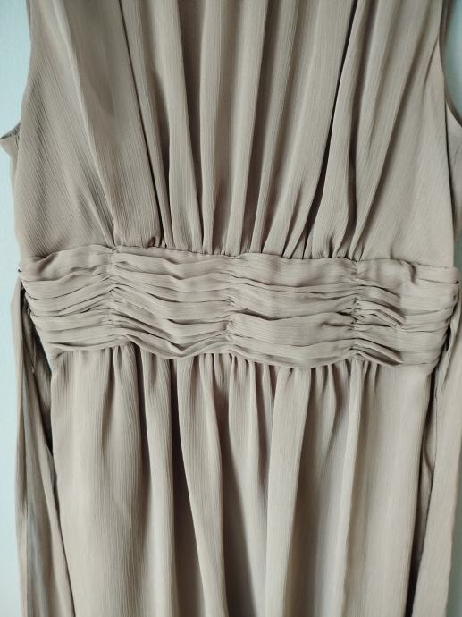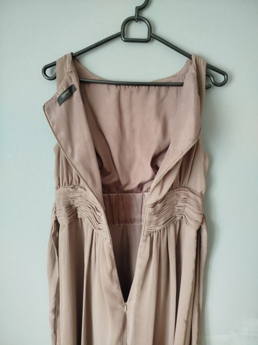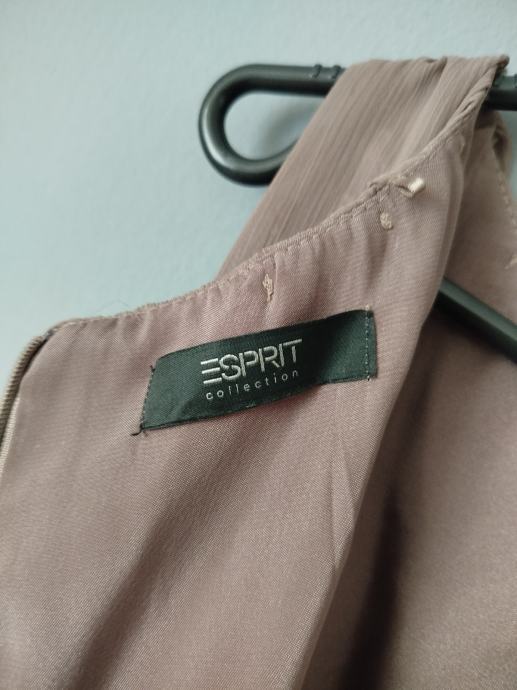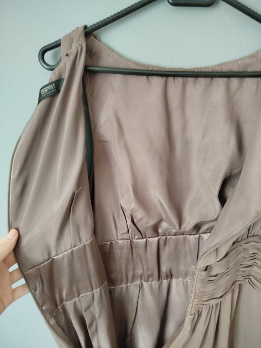 Esprit smeđe/ maslinasto zelena/ khaki haljina. Dužina malo iznad koljena, s pojasom za vezanje oko struka, bez rukava. Na leđima skriveni zatvarač. Postavljena cijelom dužinom, lepršava. Veličina 36/38. Nikad nije nošena
