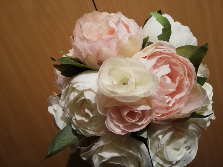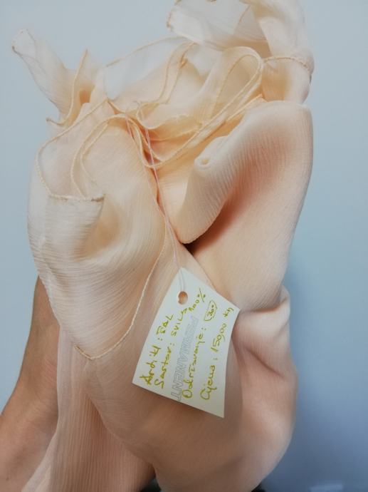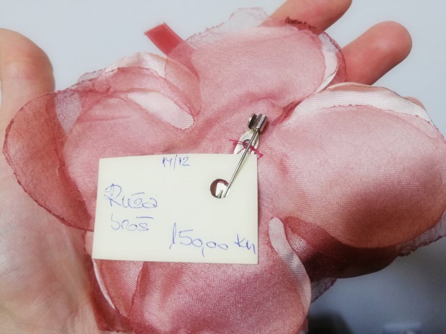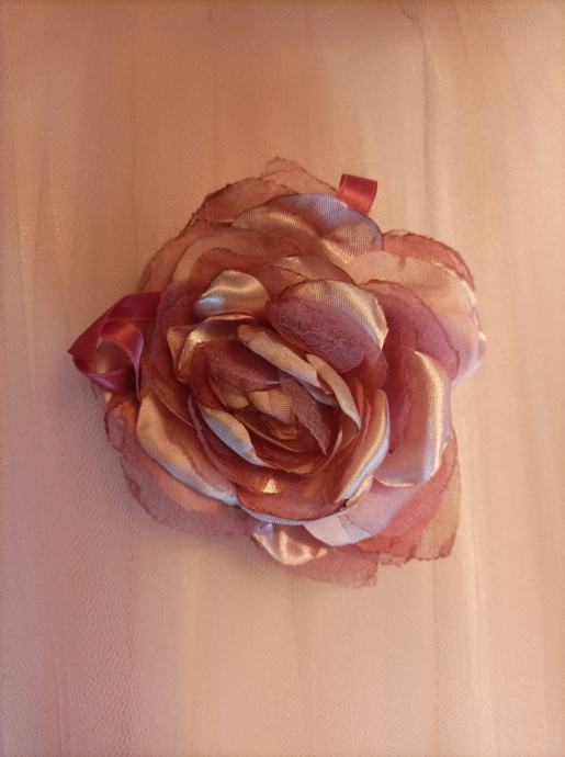 Uz haljinu dolazi i svileni šal za ramena (na slikama 4, 7), te broš u obliku ruže (od svile i satena). Imam i pasent kravatu u roza boji, za gospodina.