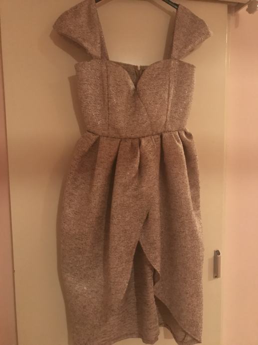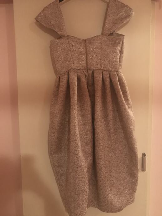 Haljina od brokata/kruti materijal, savršenog kroja. Ispod haljine ukoliko želite ide mali kolut da se haljina sto bolje raširi u krug. Ja poklanjam kolut uz haljinu. Nošena je jedan put, broj je 38. Plaćena je 1200 kn. Moze se nositi spustenih naramenica. Ukoliko želite u inbox mogu poslati slike uzivo. :)