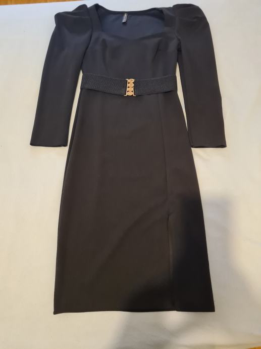 Elegantna crna haljina veličine 36 s dugim rukavima, rabljeno stanje. Klasičan model s dekorativnim remenom u struku koji naglašava figuru. Remen nov. Savršena za svečane prilike ili poslovni dress code.